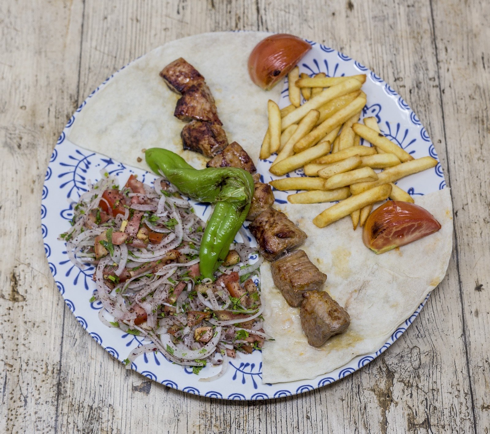 Brocheta de carne de cordero servida con arroz o patatas fritas y ensalada